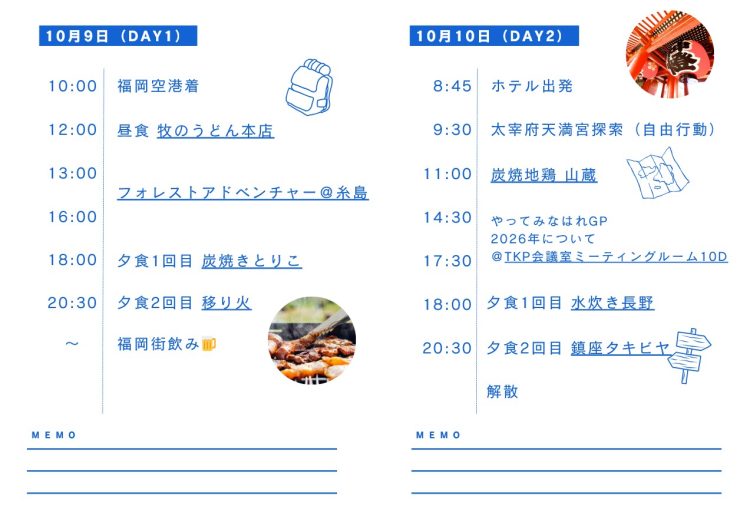 「2日目はTKP会議室を利用して研修を行いましたが、、せっかくの福岡滞在でしたので、参加メンバー同士の仲を深める目的でオフタイムは食事や観光も楽しみました。」