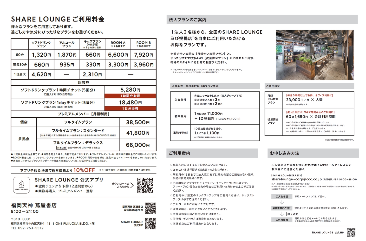 シェアラウンジの利用は、店頭での受付(または専用アプリの登録)でご利用可能です。