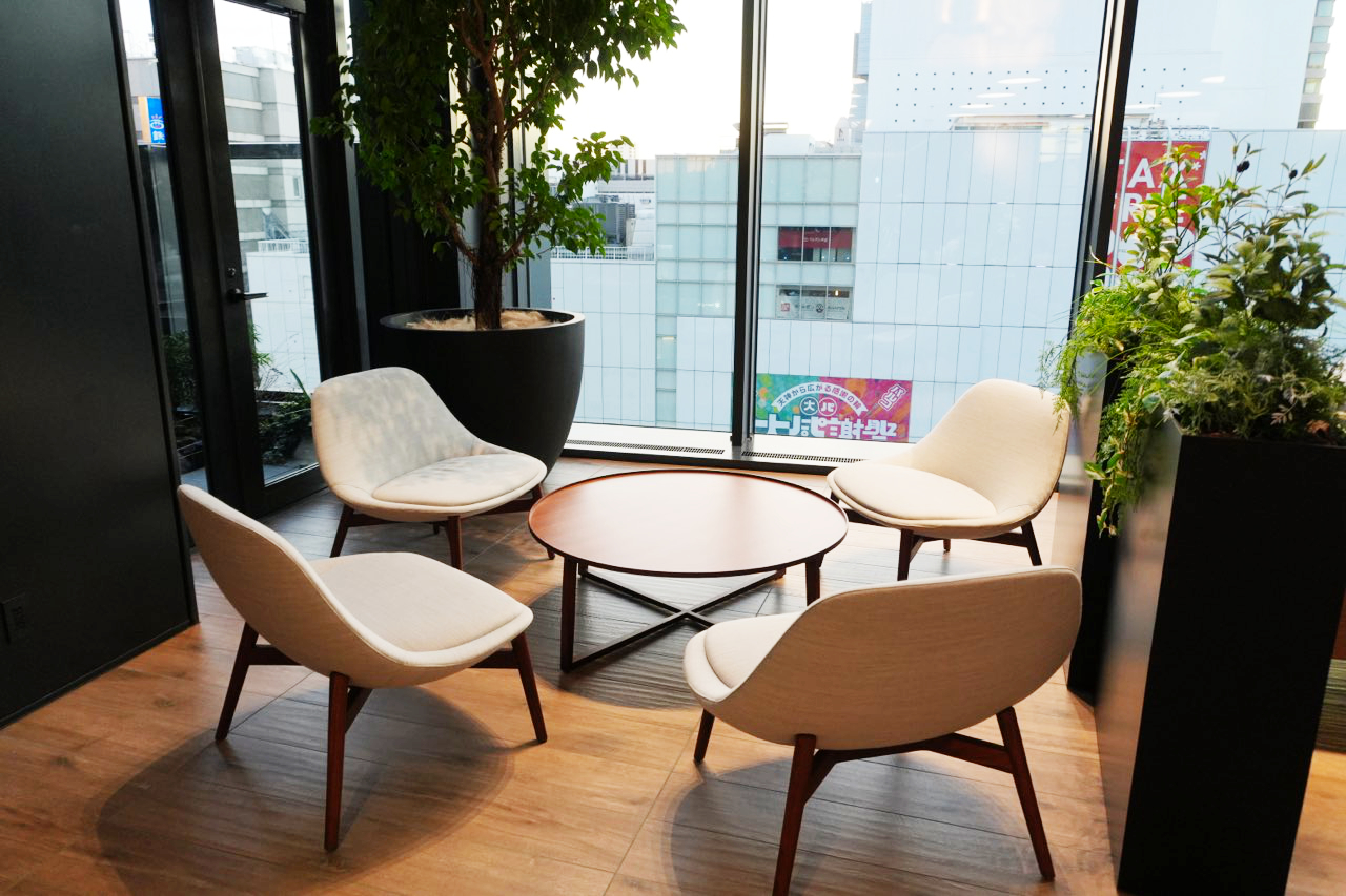 ワンビルに入居するオフィスワーカーとカフェで飲み物を購入していただいた方が自由に利用可能で、軽いミーティングや交流ができる場所として最適なスペースとなっています。